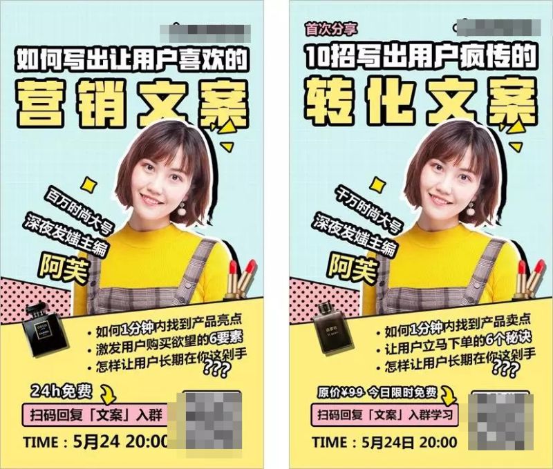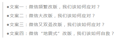 最初版和最终版 同样的问题,“如何写出XXX”是一个过程,并且“喜欢”两个字是没有标准的,所以这个版本的效果十分差。 后来做了点小改动,效果显著,几小时内就有几百人扫码要求进群。 前面我们都在强调结果的重要性,那到底怎么做呢? 就拿上面那张海报举例。当我们发现主标题体现过程效果不好的时候,我们利用了1种用户心理:求快。 2)求快型文案求快型文案的特点是速成。改后的文案是:10 招写出让用户疯传的转化文案,再比如 10 天掌握核心技能、 15 天成为摄影达人等等。 这些都是很典型的求快的文案。别以为求快很简单,里面其实还有很多坑可能会踩。 所以下面我和大家分享一条公式(做了 N 版海报,研究几百张海报总结出来的): 求快型海报文案=时间少/学习量少+呈现效果(优质) ①强调时间少 最常见的是用数字但是海报的数字有 2 个原则: 一是最好用阿拉伯数字。比起汉字,大家对阿拉伯数字比较敏感。 二是不要用一些很大的数字,否则会让人感觉时间太长,失去学习的兴趣。大家可以看看下面两版文案: ②强调学习量少,结果还不错 如果学习量大,会把学习变成一件有压力的事情,一下子就会把人吓跑。 同样看下面两个例子: 文案一是 10 招写出用户疯传的文案。这版文案,相比较文案二,学习量少,并且结果给人感觉还不错(用户疯传)。 ③修饰词要场景化,有画面感 当然,我们在修改结果的时候,重点改了修饰词,把“喜欢”变成了“疯传”,是不是很有画面感,能够体现用户发朋友圈,或者是发给好友的场景? 这里再举个例子,能够体现优质“修饰词”的威力: 就拿前几天微信改版的举例: 这 4 版文案最大的区别就在于修饰词,“频繁、大、又双叒,地震式”。 我们最后选择了第 4 版,虽然夸张了点,但是的确是相比较起来最好的。因为我们需要突出这次改版的严重性,好让大家点进来看(如果有更好的建议,欢迎底部留言)。 当然不是教大家做标题党,因为确实这次改版,很多公众号练露脸的机会都没了,程度已经比较严重了。 我们在做海报的时候,肯定会遇到这样的问题,直接说太平铺直叙,需要加一些修饰词。但是注意了,这个修饰词不能太笼统,最好有画面感或者场景化。 比如,10 招做出刷爆朋友圈的海报,“刷爆”就有一定的画面感了。 不过刷爆这个词用太多了,已经没法刺激用户了,所以我建议是不是可以换成“ 学会这 10 招,做出占领(攻陷)朋友圈的海报”? 上文我们讲了基于用户“求快”心理的文案,求快型海报文案。 其实除了可以利用用户求快的心理,还有很多用户的心理可以抓。并且,谁能抓准用户的心理,谁就能赢在起跑线上。 比如用户的恐惧心理,由于担心篇幅太长不方便展开将。如果想看的话,请在底部留言,我们下次专门写一期“如何利用恐惧心理写文案”。 接下来我们再讲一条很重要的原则,筛选目标人群。如果没有覆盖你的目标人群,你再怎么花式写文案也没用,注定传播不开。 3)筛选目标人群大家知不知道我们 10.14 号要在上海举办“ 2018 社群运营峰会”?。我们这次的主题是“社群运营峰会”,但其实一开始是“区块链运营峰会”。 可以很明显的看见区别,主体换了,区块链运营→社群运营。 为什么要这么改呢?一开始我们确实要举办区块链运营峰会,但是最近行情不好,如果还是做区块链的话,可能要翻车。 所以我们紧急商讨后,变成了社群运营峰会,将古典互联网和区块链结合在一起。 上半场是古典互联网社群运营相关的分享,下半场是区块链社区运营相关的分享。 为什么仍要放区块链社群运营?因为确实很多走在前沿的区块链公司,社群运营玩得非常 6,值得我们学习。 不过,这个时候出现了一个问题,范围扩大后, 涉及的领域变多,很多人会下意识的觉得太杂,能够学到的东西太少。 所以就需要你们把握嘉宾的质量,和她们分享内容的质量了。 因此,我们这次也耗时好几个月,邀请了 10+ 顶级社群运营操盘手,比如英语流利说,吴晓波频道。 做海报肯定会遇到这样的问题,再举个我们以前的栗子,之前我们做过一次微课,大家再来看两版主题: ●主题一:运营企业抖音,这里有 7 条建议●主题二:运营抖音,这里有 7 条建议我们最终选择是第一版,因为现在讲运营抖音的人太多了,与其和那么多人竞争,不如缩小范围,做企业抖音。 注意,这两个例子可以看出,尽可能覆盖你的目标范围,可以是放大也可以是缩小,具体还要看视情况而定。 最后,这里再提一点,你还可以增加副标题来补充主标题。比如我们这次大会的主标题是“2018 社群运营峰会”,小标题就就是“解锁社群新玩法,唤醒新势能”。 再比如这张,同样增加副标题来补充主标题。 如何包装出用户首选的内容?前面,我们讲述了戳中用户需求痛点的方式,这其实只是迈出了高转化海报的第一步。但要让你的产品在海量产品中脱颖而出,成为用户的首选并付费,还需要对内容进行包装。 如何理解这句话的意思呢?我们举个特别通俗的例子: 某天,你晚上 9 点多下班回家,这时候觉得肚子特别饿,路过地铁口的时候,恰巧有很多小吃摊,小吃摊的食物都能帮你解决“饥饿感”这一需求痛点。 这个环节就好比高转化海报中的“主题”,抓住了用户的痛点,吸引了用户的眼球。 然而,有五家小吃摊都在卖你最爱吃的臭豆腐,他们中只有一家会成为你的首选。这时候,身为用户的你就会考虑臭