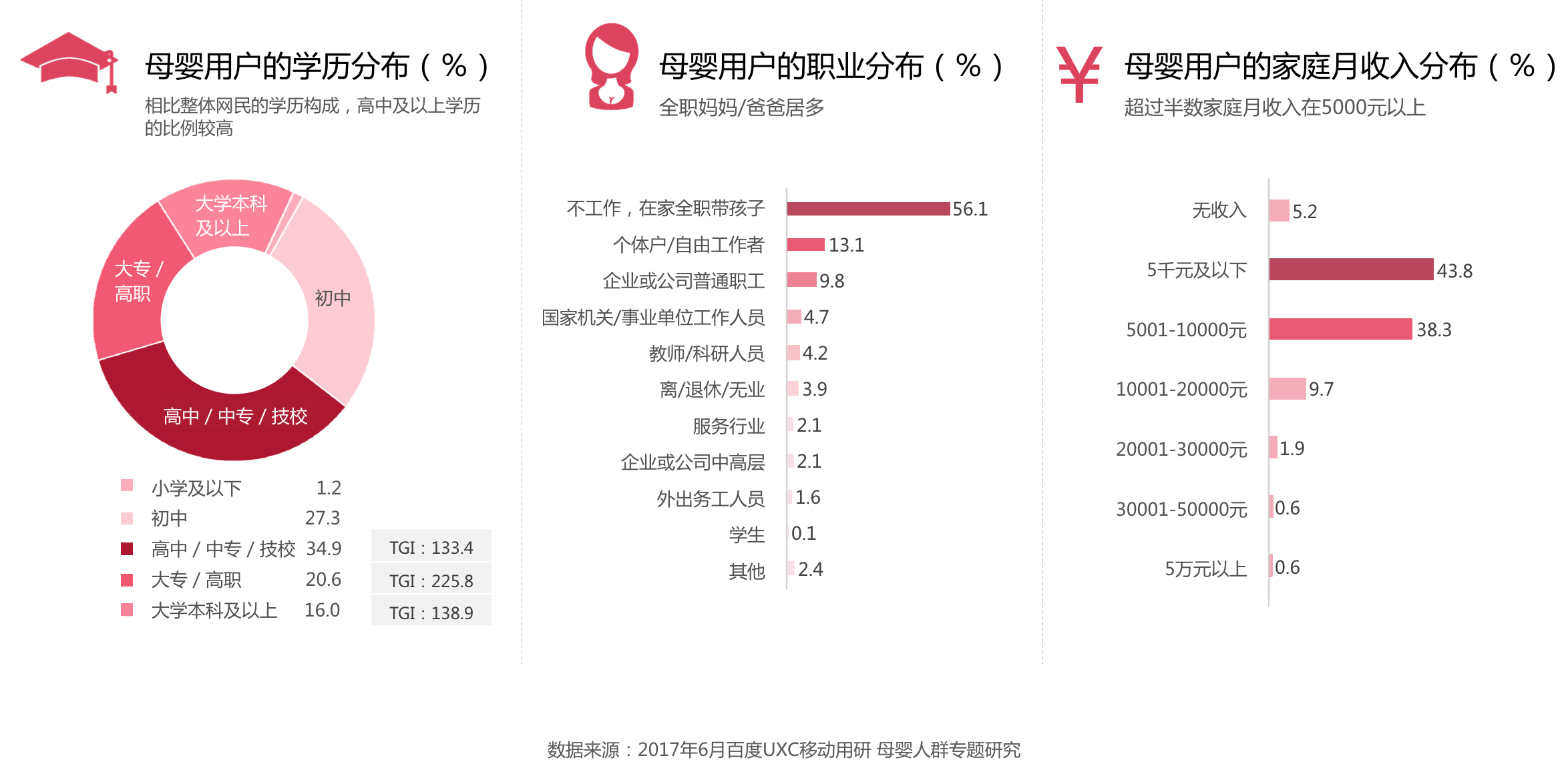 女性占绝大多数;年龄相对年轻、集中在20-34岁;中等教育程度超6成,相比整体网民学历较高;全职带孩子的较多;超过半数家庭月收入在5000元以上;城镇居民超7成;居住区域上三成在华东,近两成在华中;生育一胎为主,二胎/多胎用户有所增长;近7成孩子处于孕育核心阶段(孕中期到孩子3岁);以小家庭自己照顾孩子为主。
