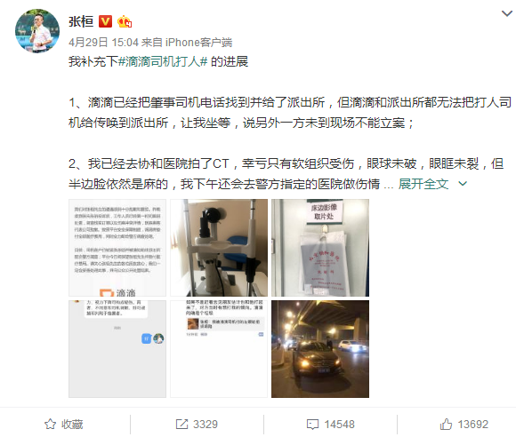 4月29日10点27分,滴滴通过官方微博首次回应此事,向张桓致歉,表示愿意垫付医疗费用,说明司机账户已被冻结,也已通知本人前往派出所。