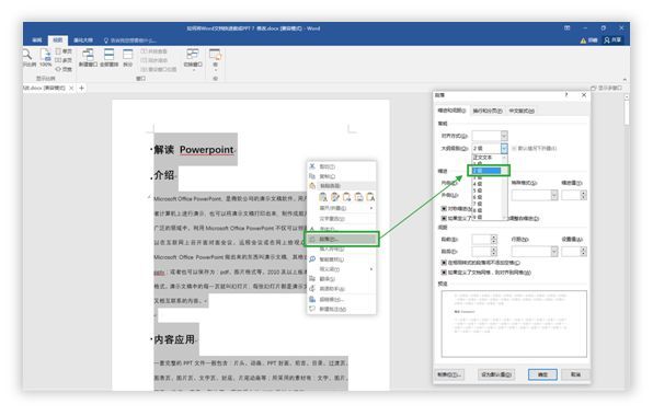 对于文字大纲级别的设置,有一个快速的方法,先按【Ctrl+A全选】—【右击鼠标】—【段落】—【大纲级别】,最后统一将其设置为2级。