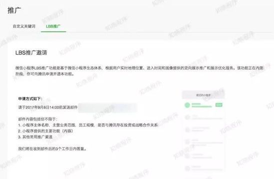 想要申请「LBS 推广」功能?知晓程序为你准备了详细版申请方式及注意事项,在我们的微信后台回复「0901」,马上获取!