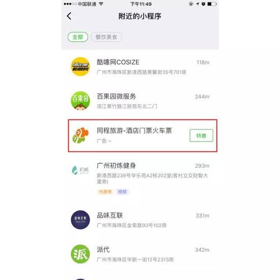 在「附近的小程序」列表的第三位,偶尔也会出现带有「广告」字样的小程序。