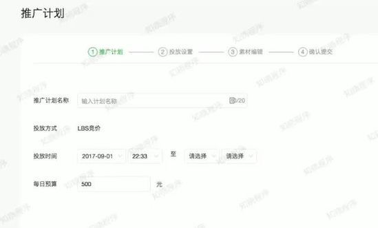 在上线推广之前,首先要新建一个「推广计划」。一个「推广计划」包含名称、投放方式(目前只有「LBS 竞价」一项)、投放时间和每日预算。