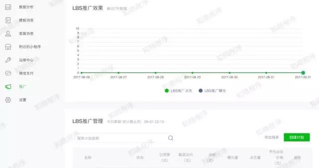 推广计划设定成功后,你可以在小程序后台的「推广」-「LBS 推广」中,查看 LBS 推广效果。