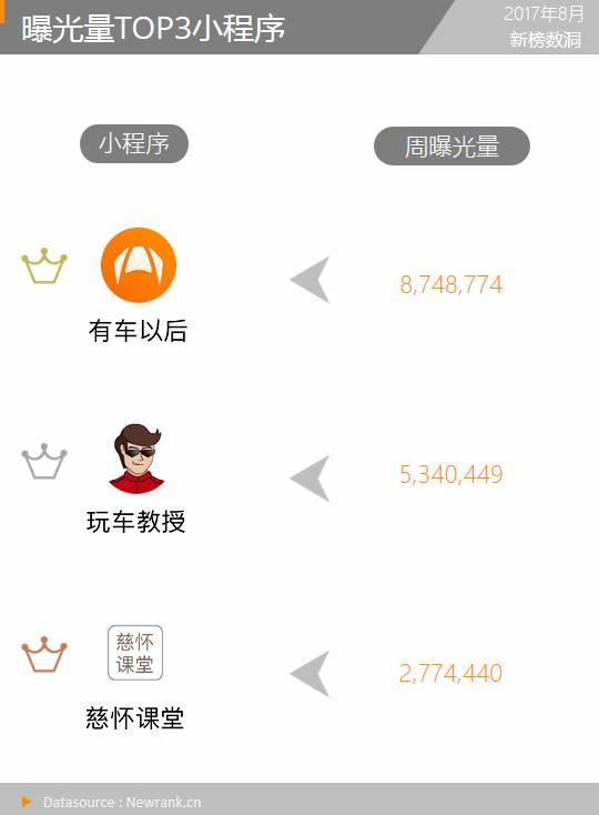 以插入小程序的推文阅读数作为曝光量,在一周时间内,专注汽车资讯的“有车以后”,被同一认证主体(广州市有车以后信息信息科技有限公司)下的3个公众号(其中2个为500强账号:“一起去SUV”及“有车以后”)推送118篇,获得了至少8748774次曝光。位于周曝光量第二位的是同为汽车资讯类小程序——“玩车教授”,之后则是付费内容商城的小程序“慈怀课堂”。