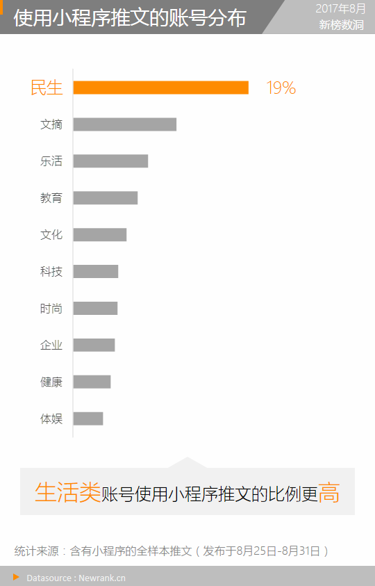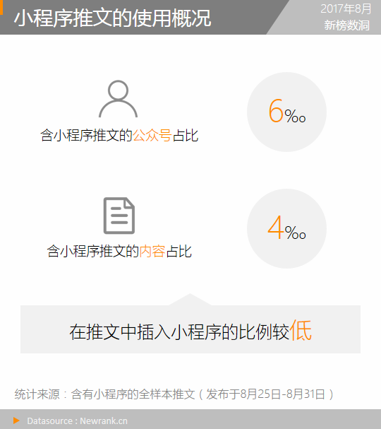 8月25日至8月31日内,全样本中共计有198056个公众号发布了3149146篇内容,其中有1285个公众号在其13330篇推文中插入了小程序;由此可知每千个公众号约有6个公众号会发布小程序推文(指在推文中中插入了小程序),而从内容的角度来说,每千篇内容约有4篇为小程序推文。这说明,目前小程序推文使用范围还较小。