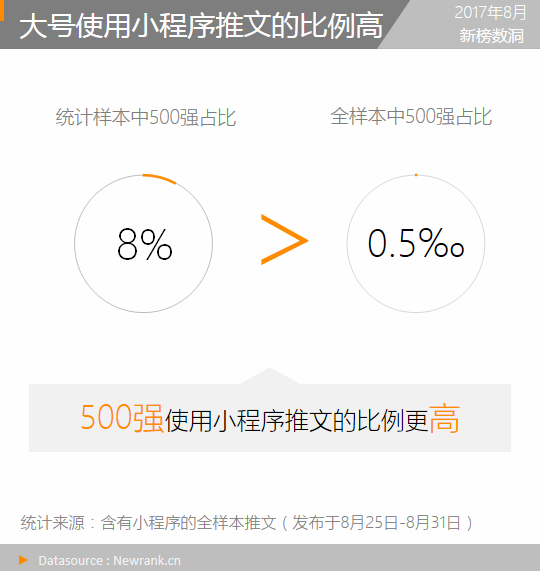 新榜发现,大号相对更多地使用小程序推文。在使用小程序推文的公众号中,其500强账号(指曾经进入过新榜500强的公众号)的占比约为8%,而此比例在全样本中仅为5‰。或由于小程序的开发门槛,使得头部账号优先尝鲜,而中小类型的公众号望而却步。