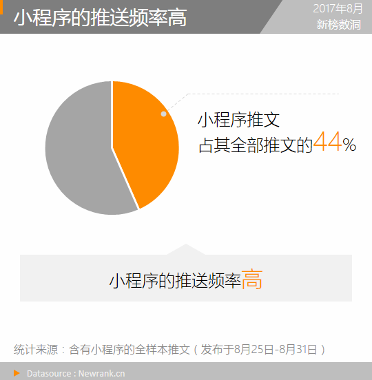 小程序推文的使用频率高吗?以那些被监测到发布小程序推文的公众号为观察对象,小程序推文占其八月最后一周总推文的44%,几乎每2篇内容中就有一篇插入了小程序。小程序的推送频率较高。