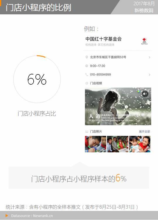 今年4月26日,公众平台还开放了一项快速创建门店小程序的服务。门店小程序,类似店铺名片,一般包含门店名称、简介、联系方式、地理位置等信息。据统计,在上述967个小程序中,仅有55个门店小程序,约占比6%。一般使用这些小程序的公众号多为地域类型的个体工商户或企业;值得注意的是中国红十字基金会也使用了快速创建功能。