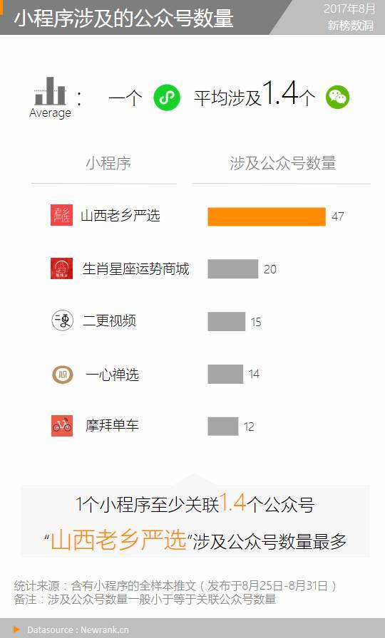 微信平台规定:1个小程序最多可以关联50个公众号,而1个公众号则可以关联10个同一主体小程序,3个不同主体小程序。相互关联之后,还可以解除关联。由于公众号只能在推文中插入已经关联的小程序,新榜将通过小程序推文反向推导部分还原小程序和公众号的关联关系。根据统计,一个小程序平均涉及1.4个公众号。即一个小程序至少被1.4个公众号关联。当小程序未在公众号推文中出现过,真实关联数值或高于此。电商导购类小程序””“山西老乡严选”总计被其同一认证主体的47个公众号在推文中所涉及,为当前涉及公众号数量最多的小程序;紧随其后的是“生肖星座运势商城”,涉及20个公众号。位于第三的是提供视频富媒体资源的“二更视频”。