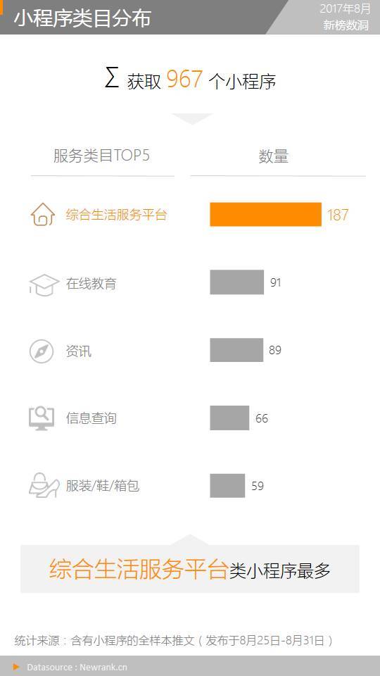 新榜共计在全样本8月最后一周的推文中搜集到967个小程序。微信公众平台规定,1个小程序最多可关联5个类目,一个月可申请修改3次。倘若以小程序的类目来对其进行划分,新榜总共统计到116个小程序服务类目。“综合生活服务平台”是使用最广泛的小程序类目,共计有187个小程序提供此类目相关的服务;其次是在线教育、资讯、信息查询以及服装/鞋/箱包;由此推测,小程序更多被用作提供生活服务、工具使用或者商品导购。
